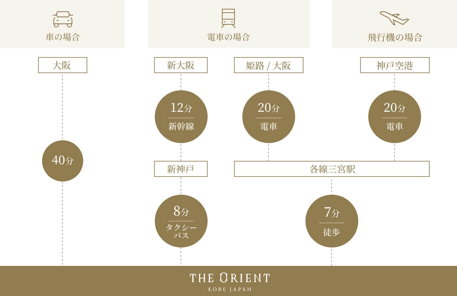 ・東京より約180分。 東海道・山陽新幹線「東京」駅または「品川」駅より「新神戸」駅へ。