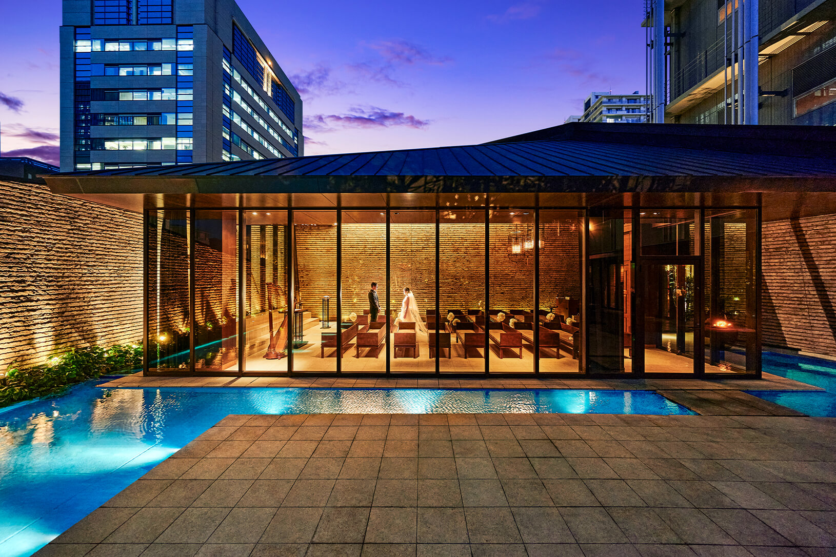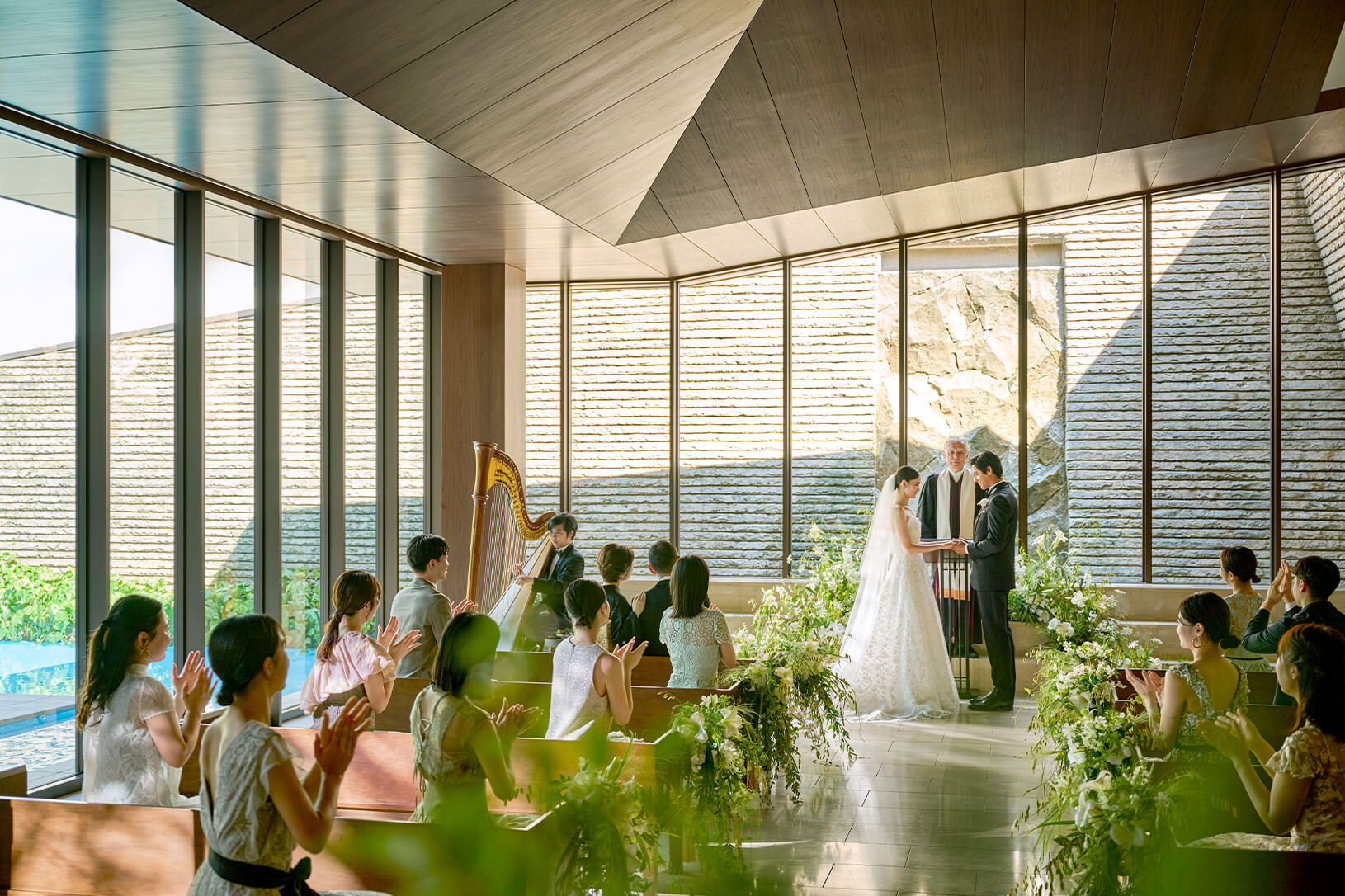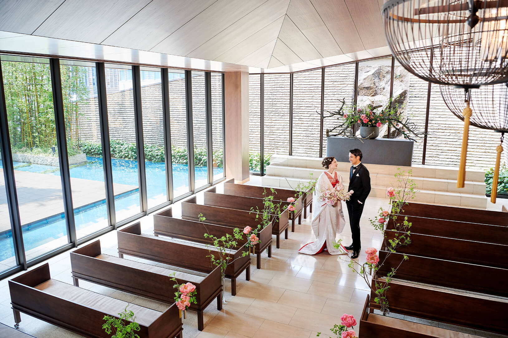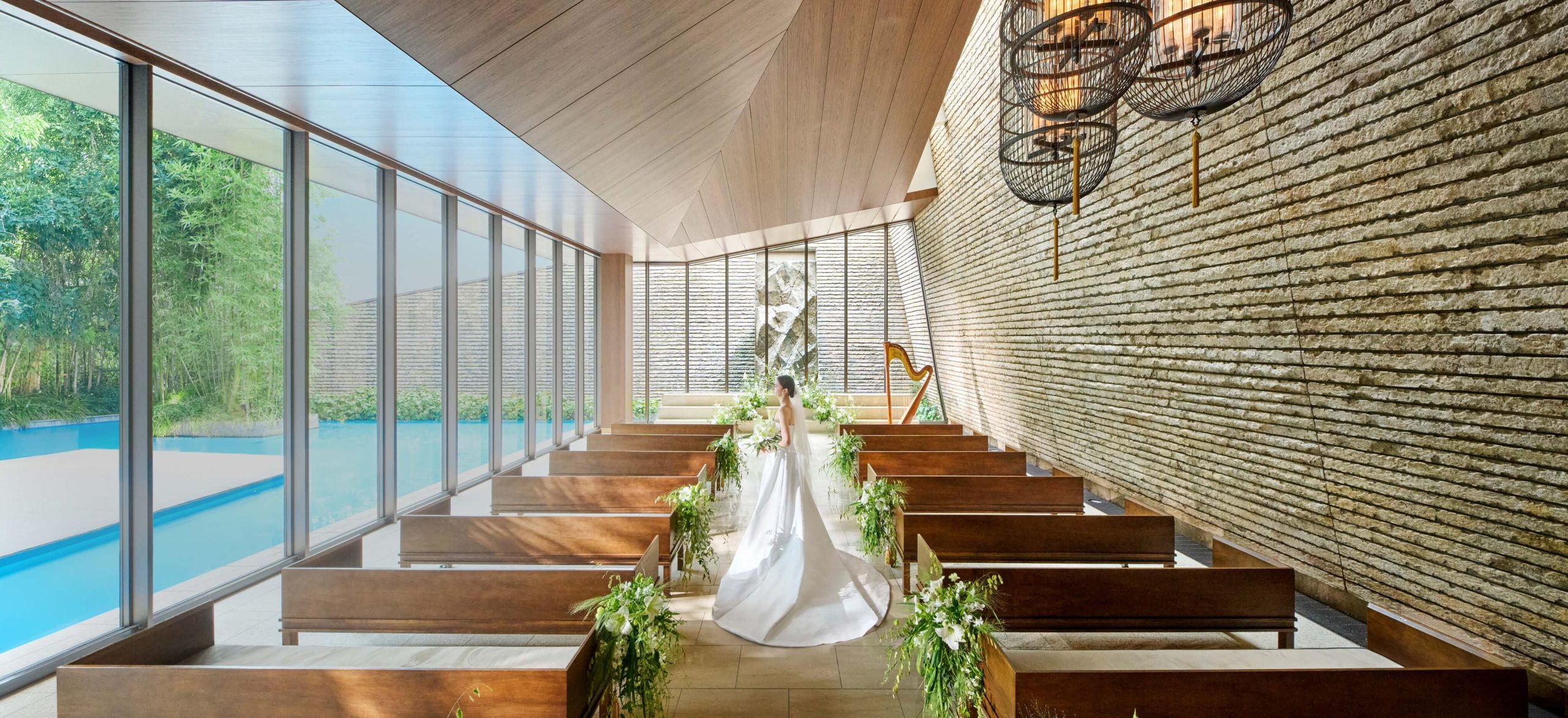 光り輝くウォーターテラスに隣接する、 独⽴型のチャペル。⽊や⽯などの天然素材で造られた 温もりを感じる空間です。