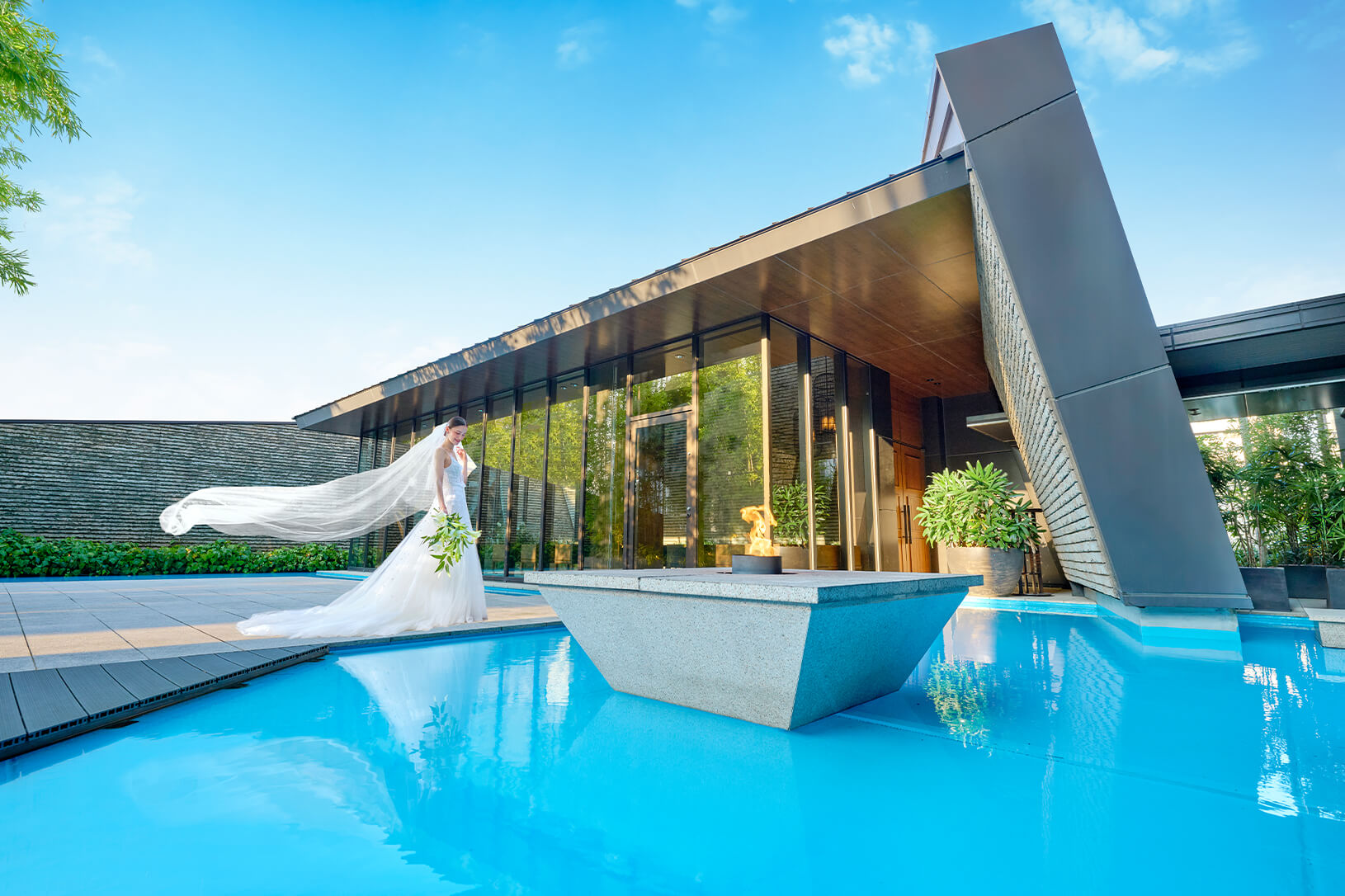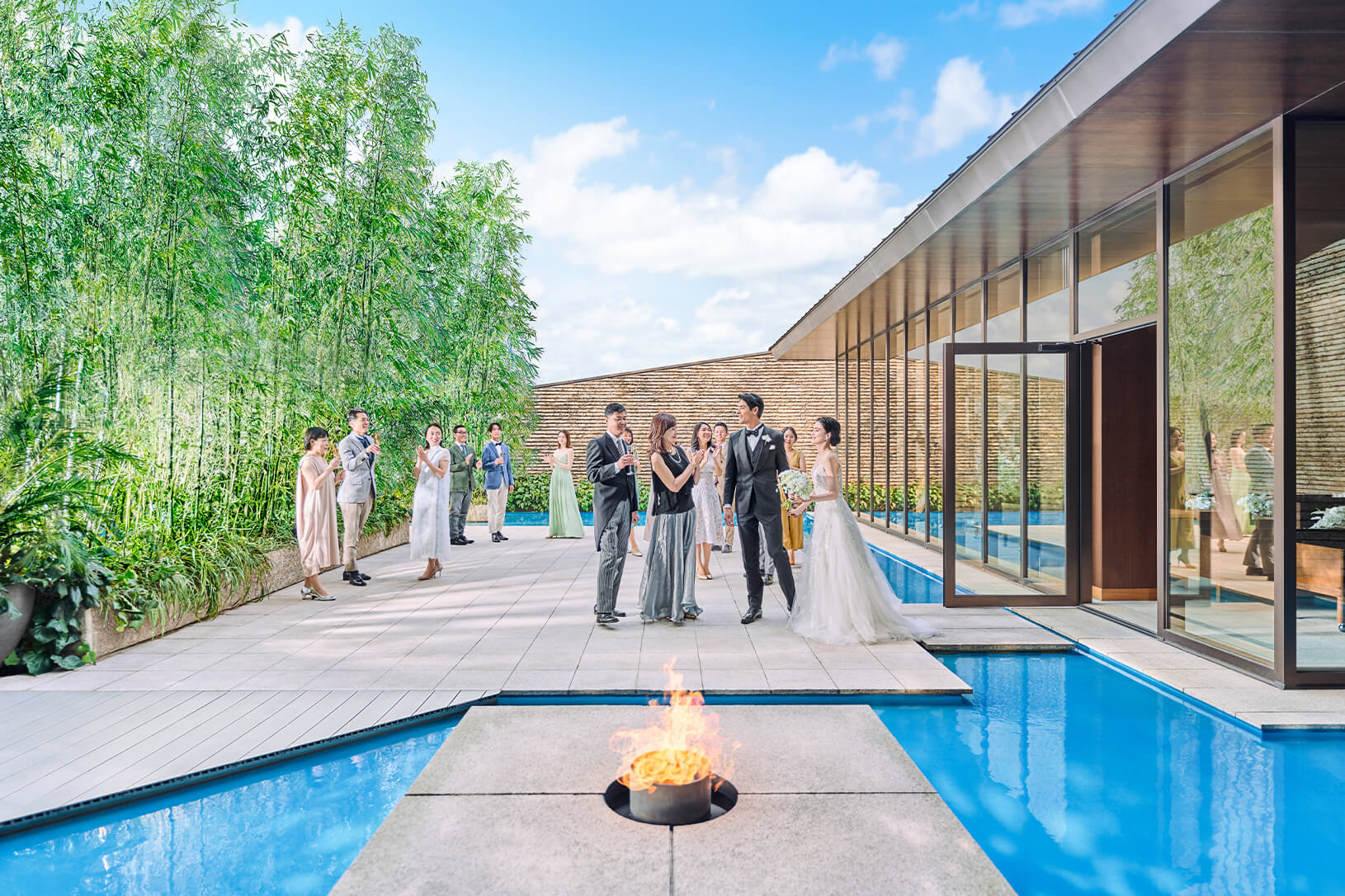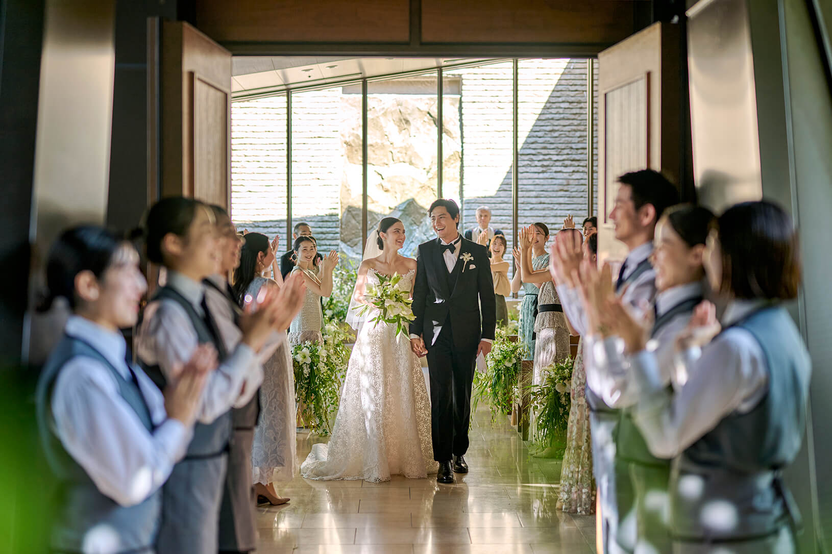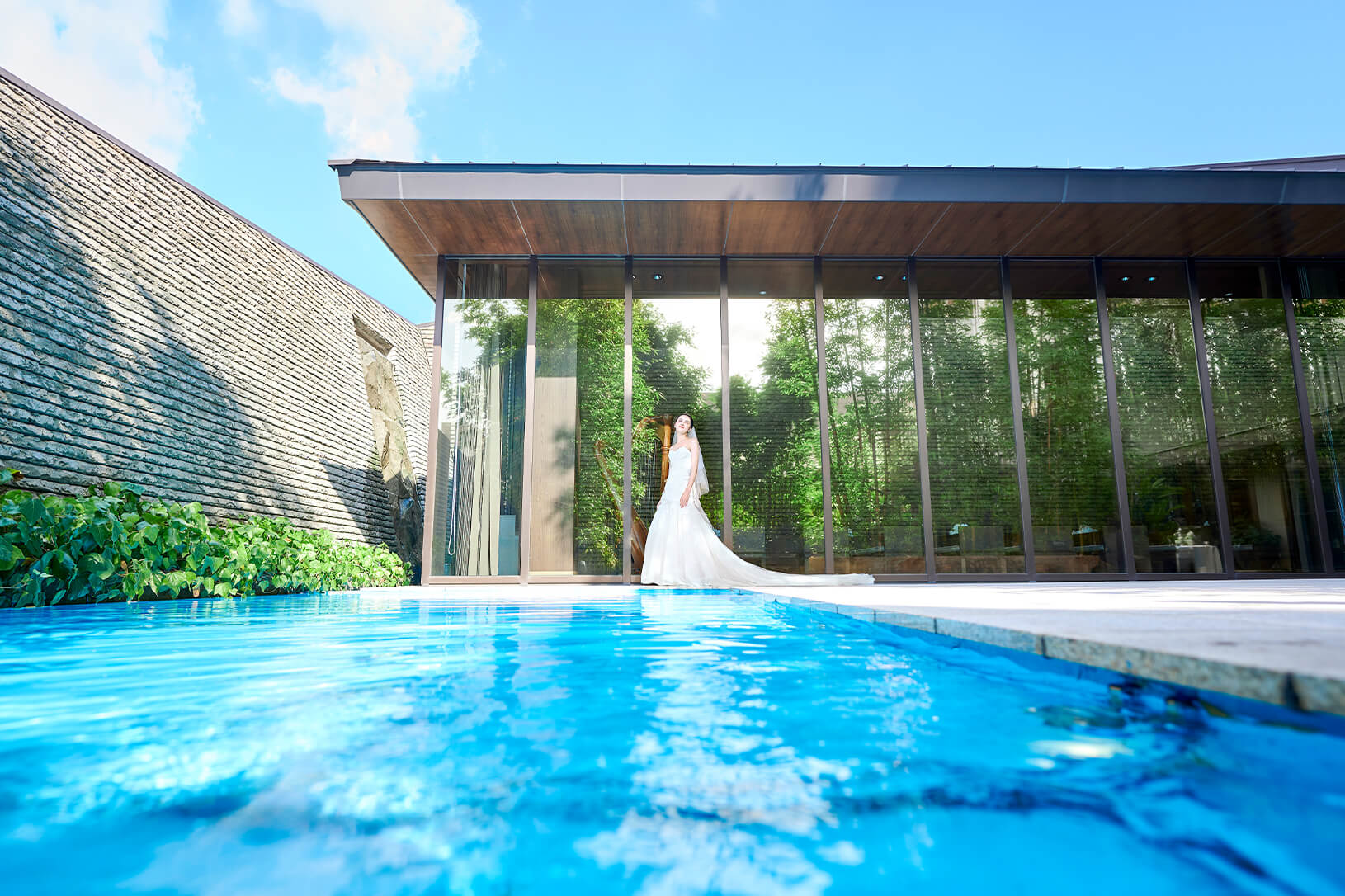 光り輝くウォーターテラスに隣接する、 独⽴型のチャペル。⽊や⽯などの天然素材で造られた 温もりを感じる空間です。