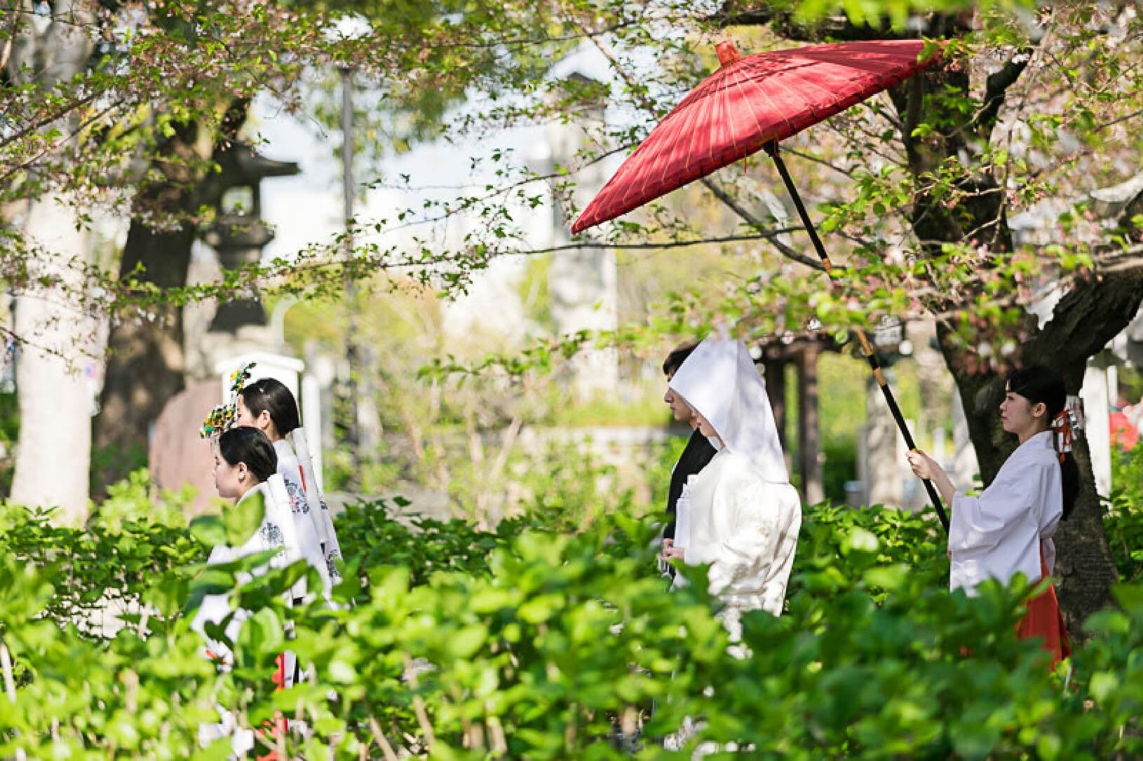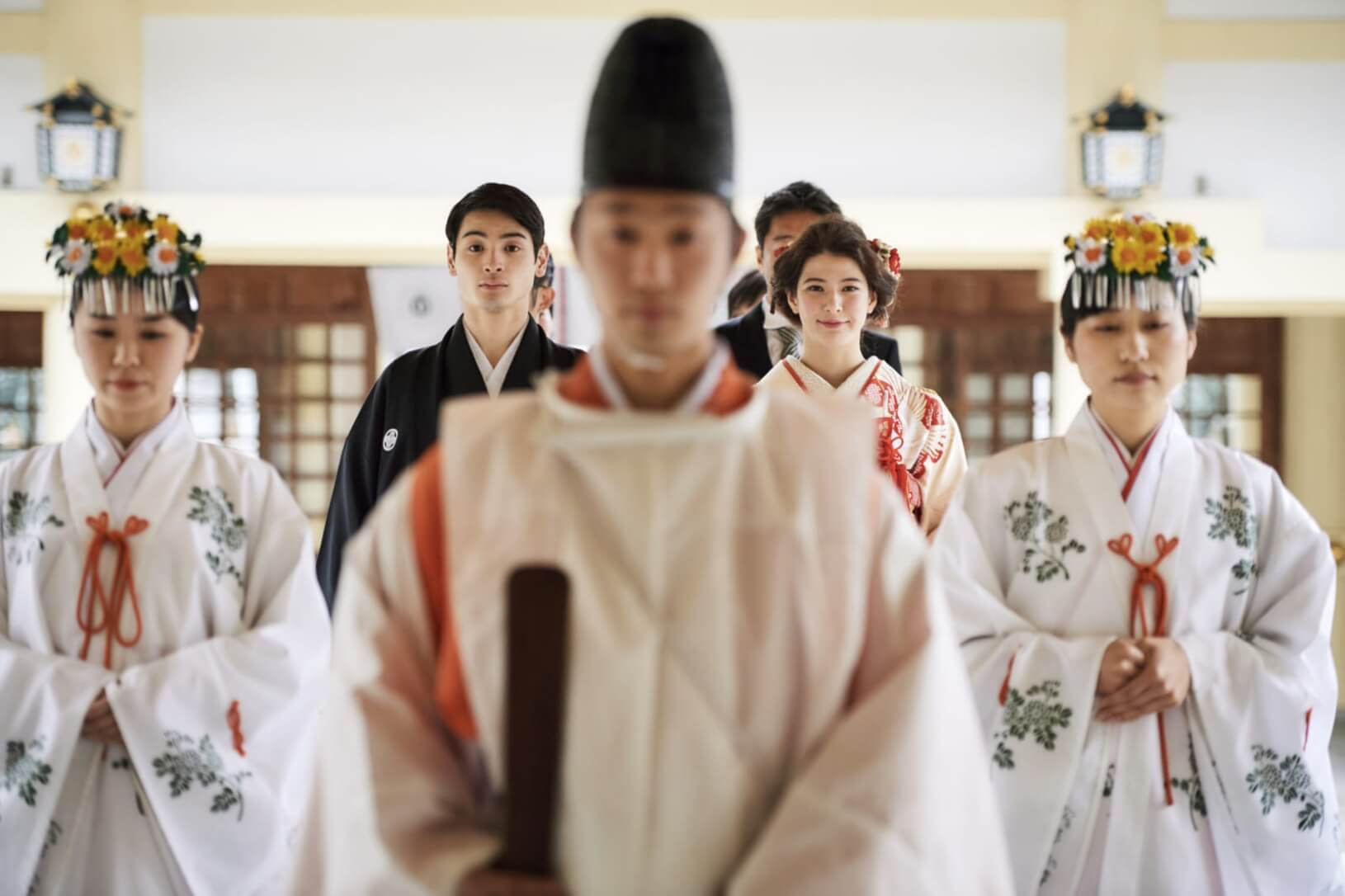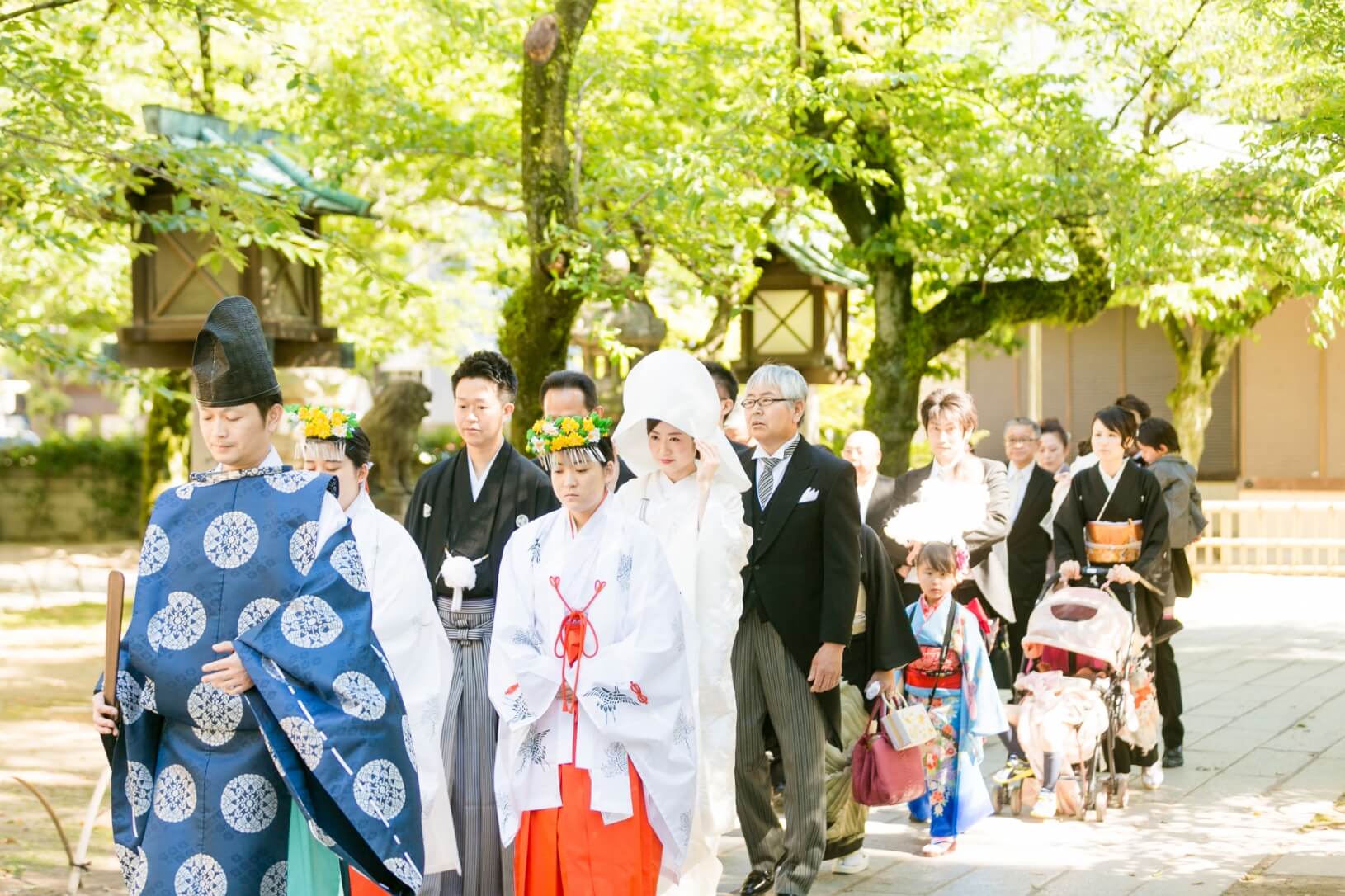 参列者とともに歩む花嫁行列など、家族や友人との繋がりをより深く感じることができる神前式。神戸市内での挙式が可能です。神社からホテルへのご移動には、送迎バスやタクシーのご手配も可能です。