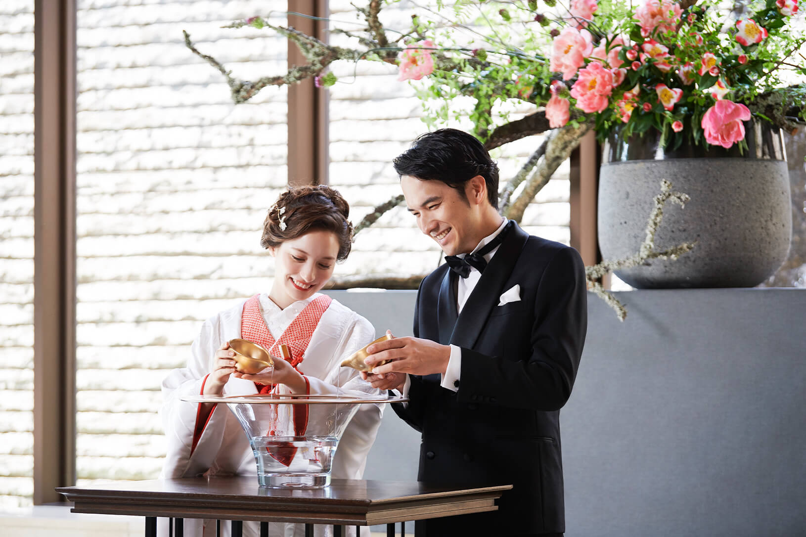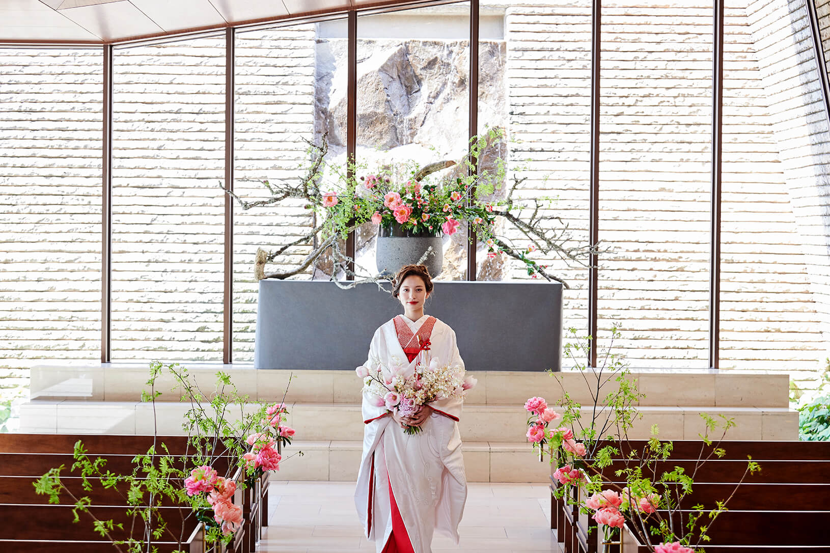 おふたりの実家から汲んできた水をひとつの杯に注ぎ合わせた水を飲む「水合せの儀」や、互いの紐を編み合わせてひとつの紐とする「組紐の儀」など、日本の心を演出に取り入れた和婚式が可能です。木と石で造られた挙式会場は、白無垢や色打掛も美しく引き立てます。