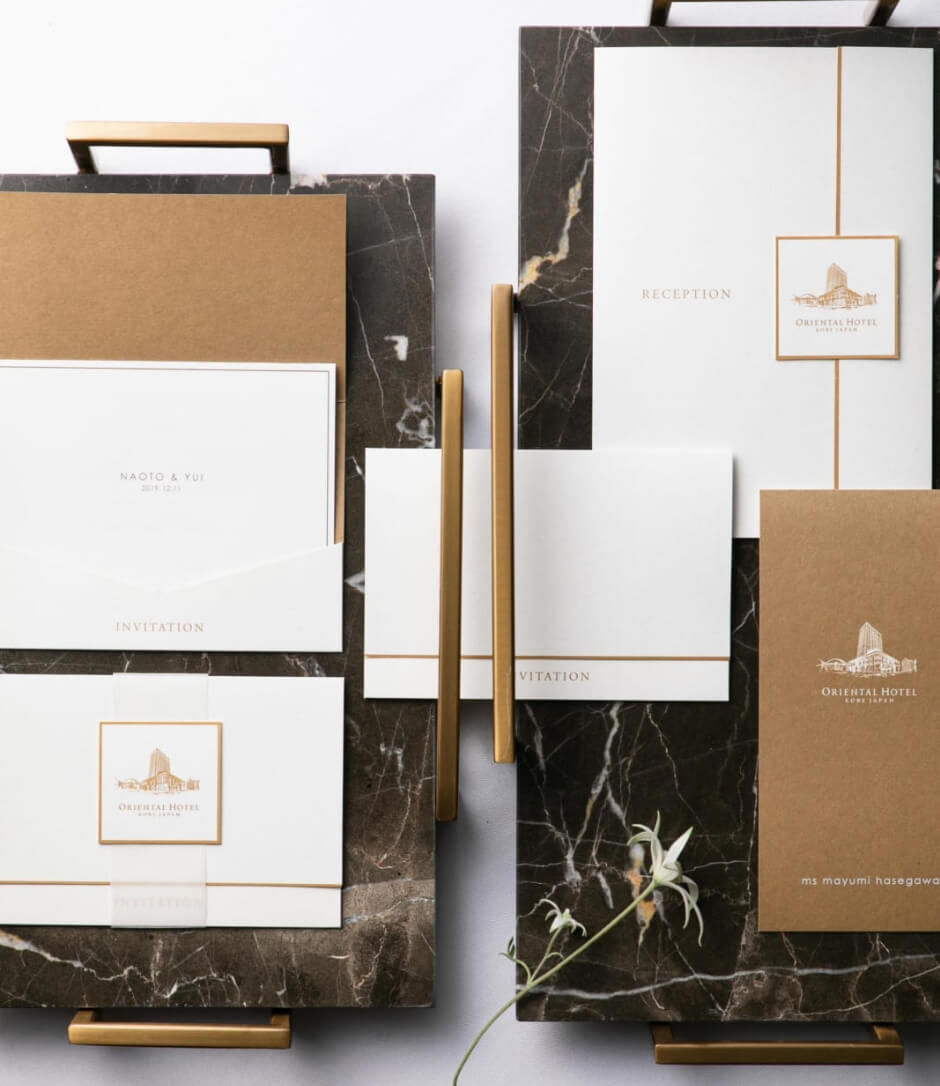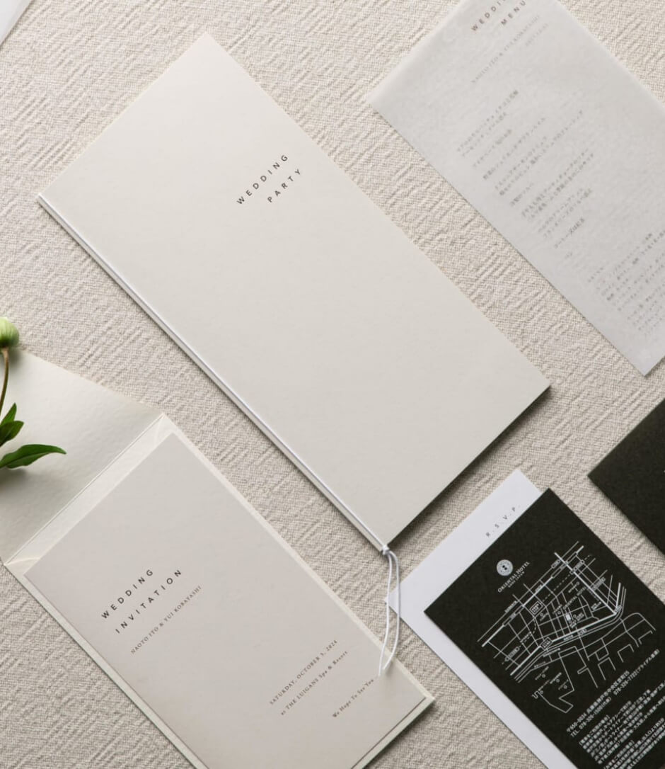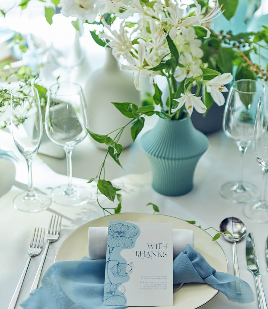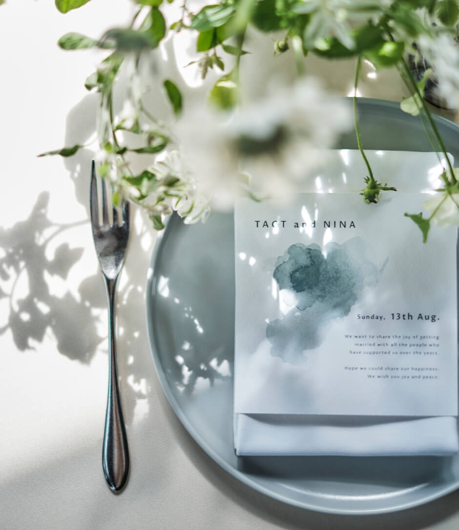 一番最初にゲストの元へ届く招待状、受付でお渡しする席次表、お席に着くと真っ先に目に入るメニューや席札。クラシカルなデザインはもちろん最新トレンドにもアンテナを貼り、多種多様なアイテムをご用意しております。おふたりが叶えたいテーマに合わせて会場の雰囲気とのトータルコーディネートをご提案いたします。