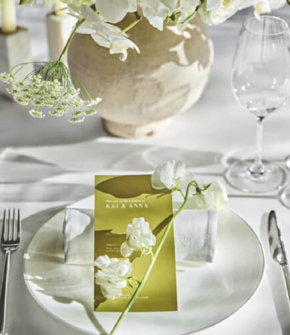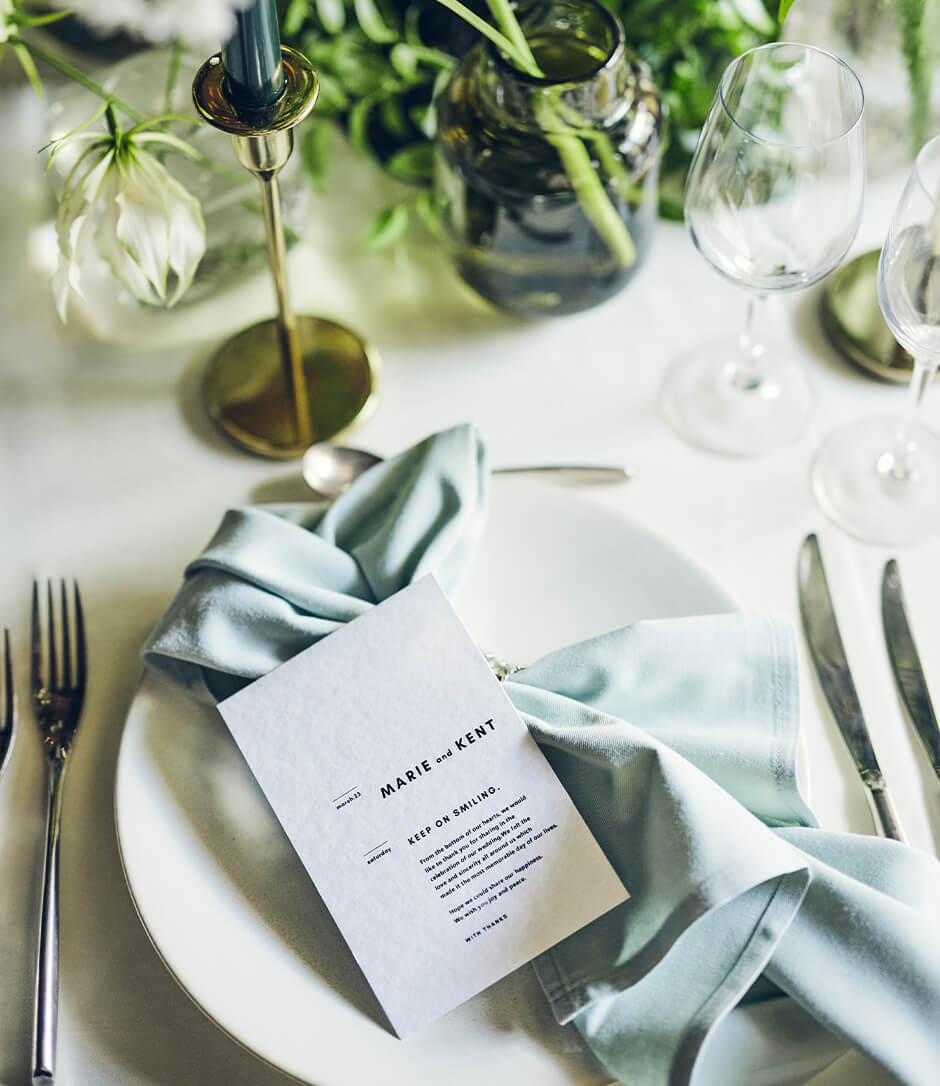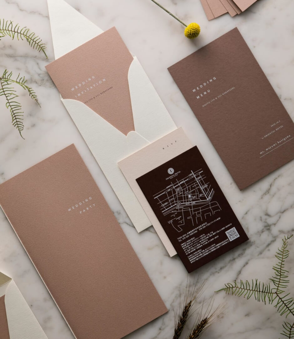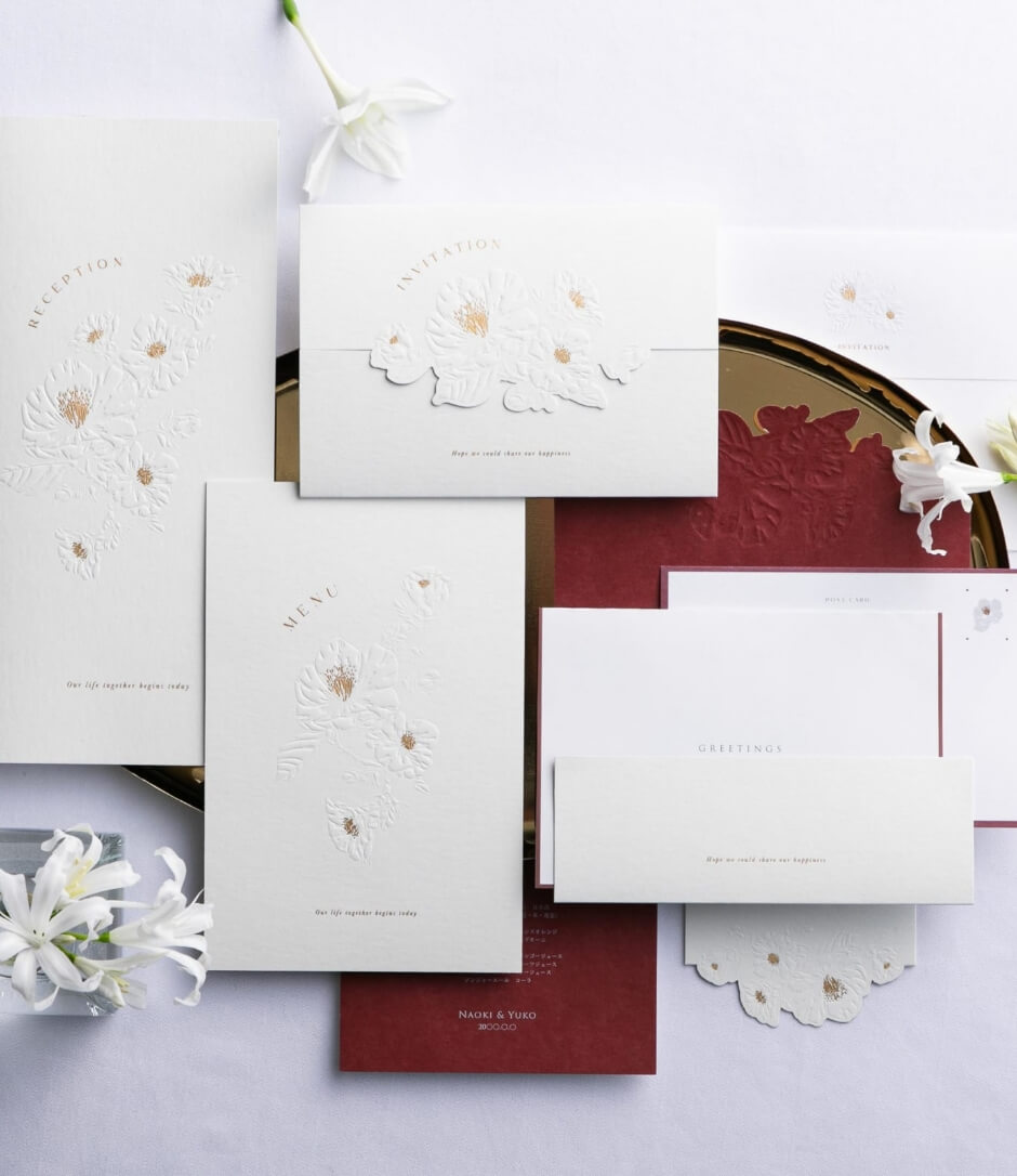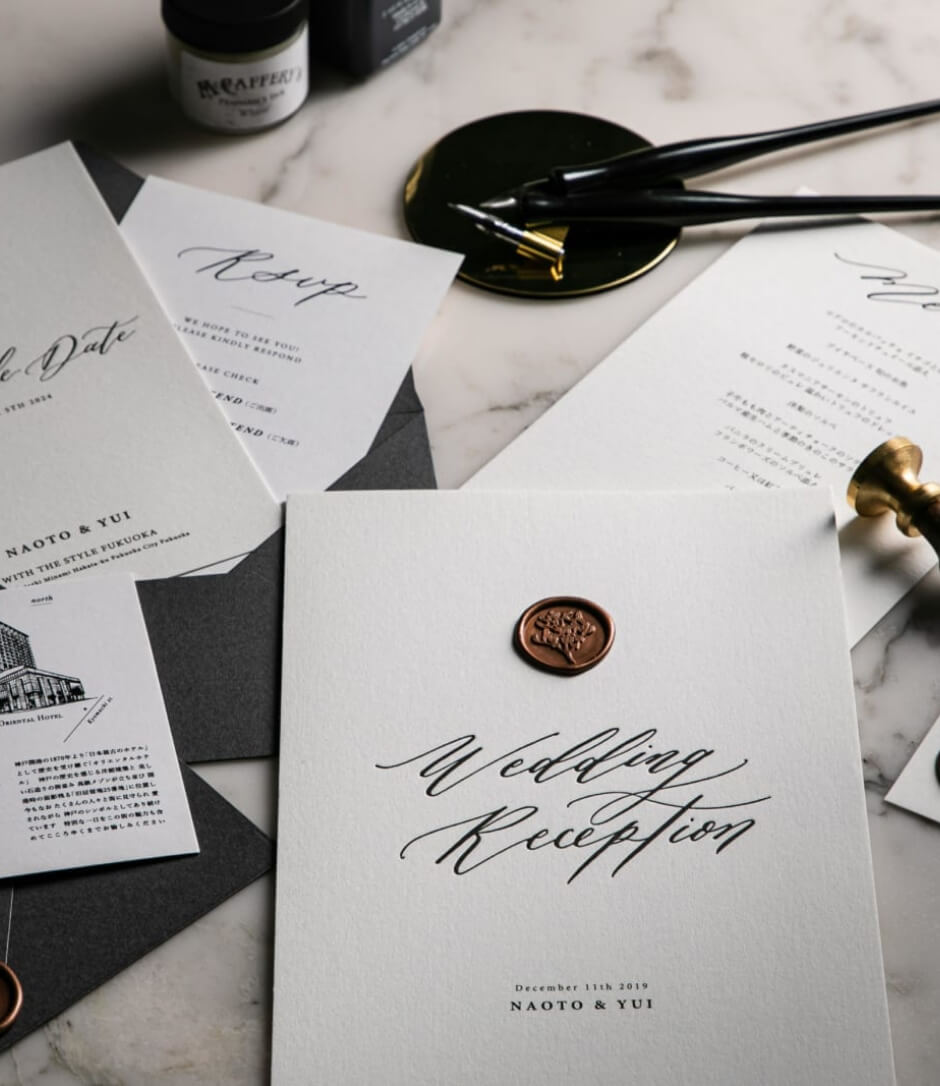 一番最初にゲストの元へ届く招待状、受付でお渡しする席次表、お席に着くと真っ先に目に入るメニューや席札。クラシカルなデザインはもちろん最新トレンドにもアンテナを貼り、多種多様なアイテムをご用意しております。おふたりが叶えたいテーマに合わせて会場の雰囲気とのトータルコーディネートをご提案いたします。