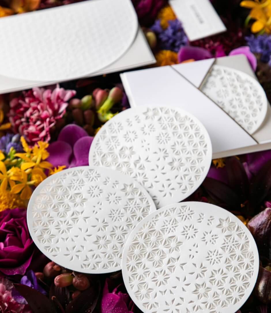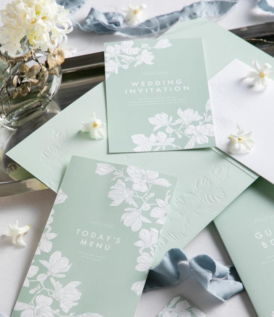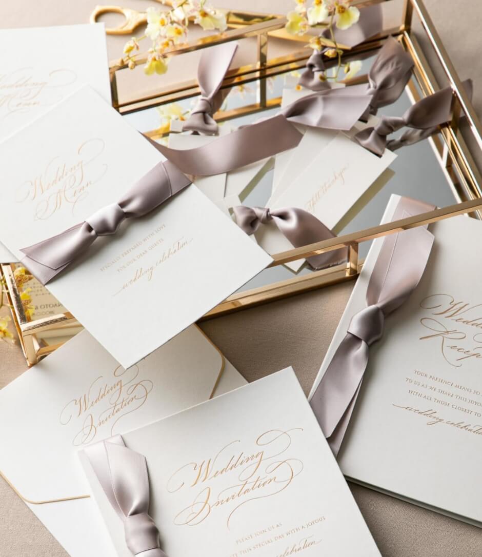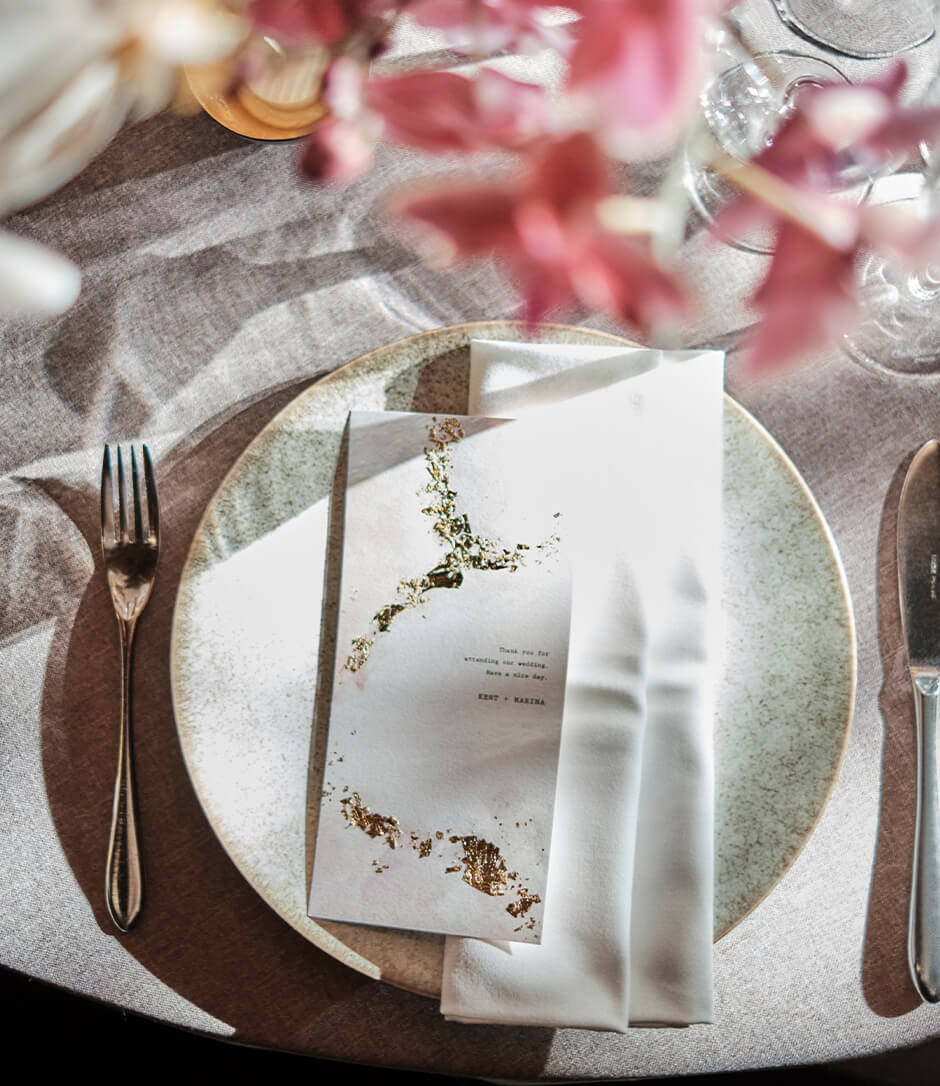 一番最初にゲストの元へ届く招待状、受付でお渡しする席次表、お席に着くと真っ先に目に入るメニューや席札。クラシカルなデザインはもちろん最新トレンドにもアンテナを貼り、多種多様なアイテムをご用意しております。おふたりが叶えたいテーマに合わせて会場の雰囲気とのトータルコーディネートをご提案いたします。
