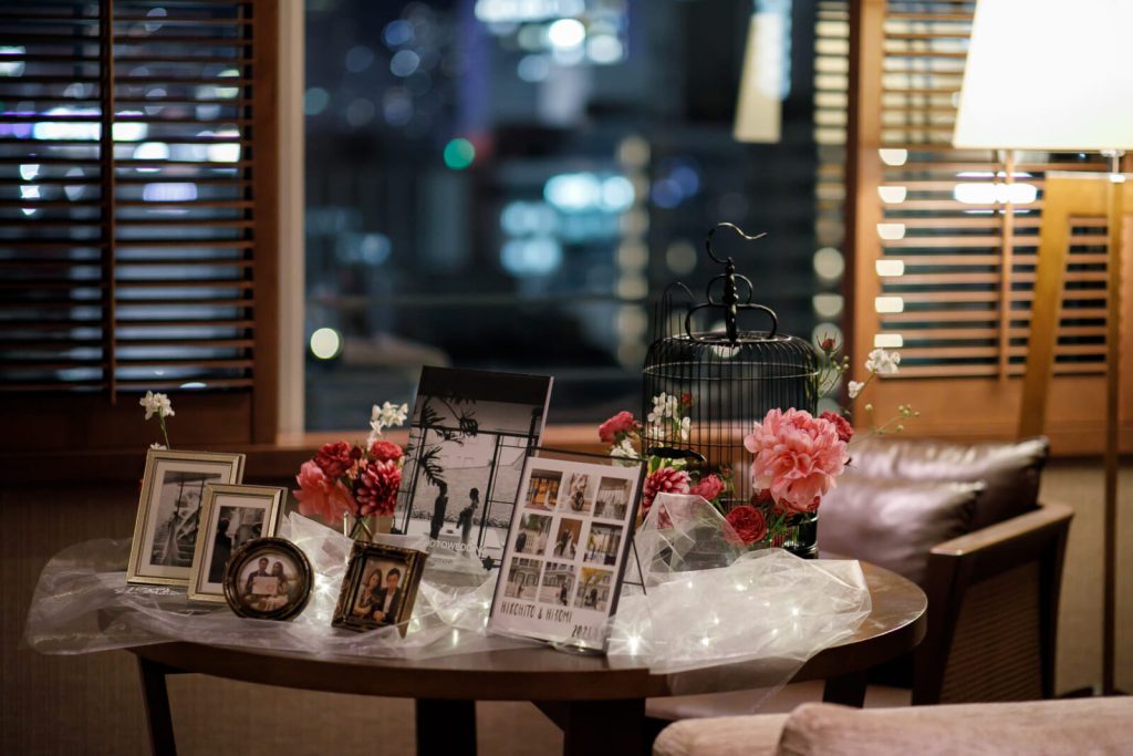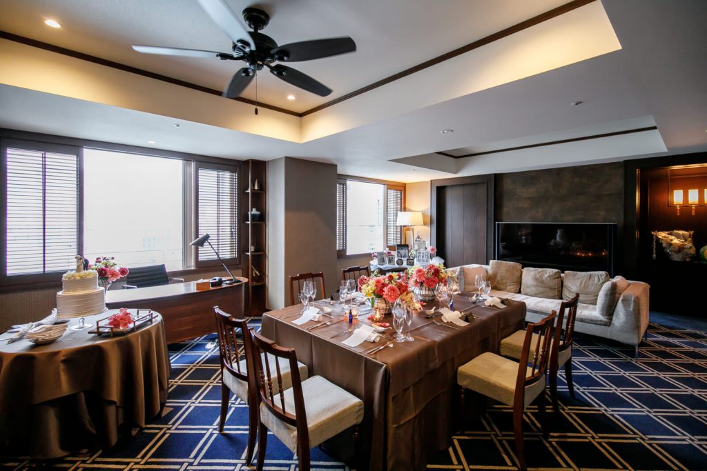 会場コーディネートの華やかな装飾をそのままに、パーティーを行ったそのお部屋でご滞在