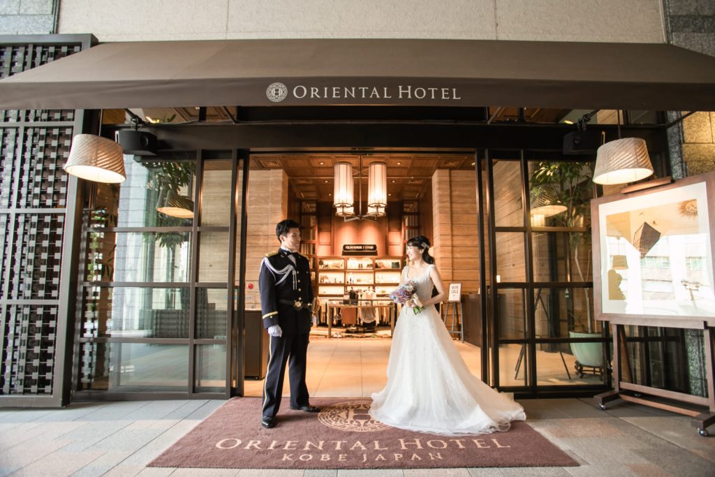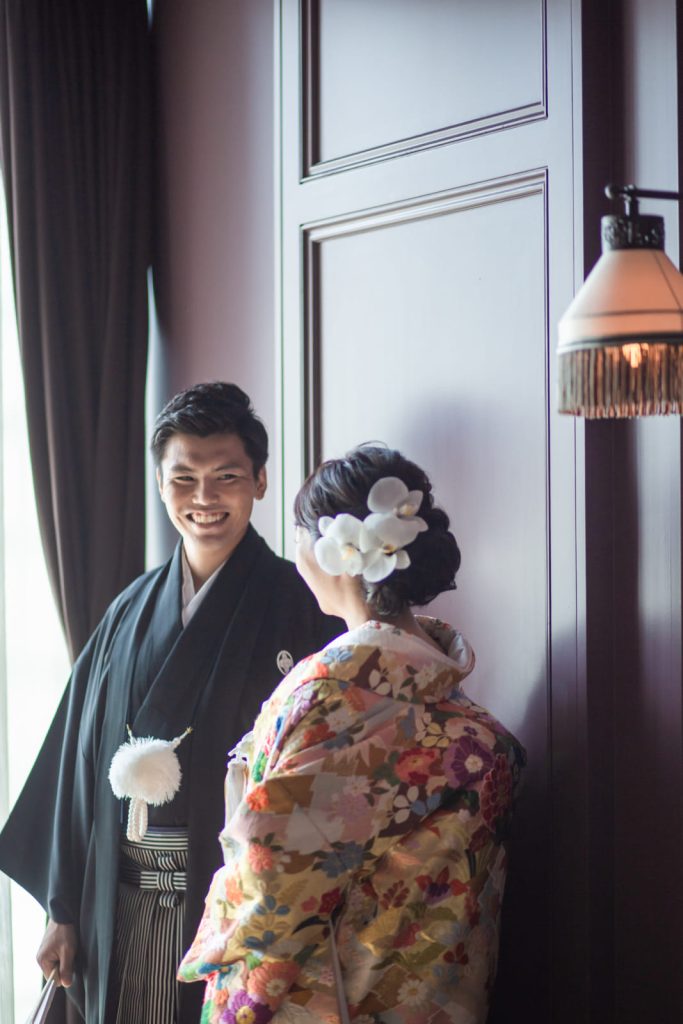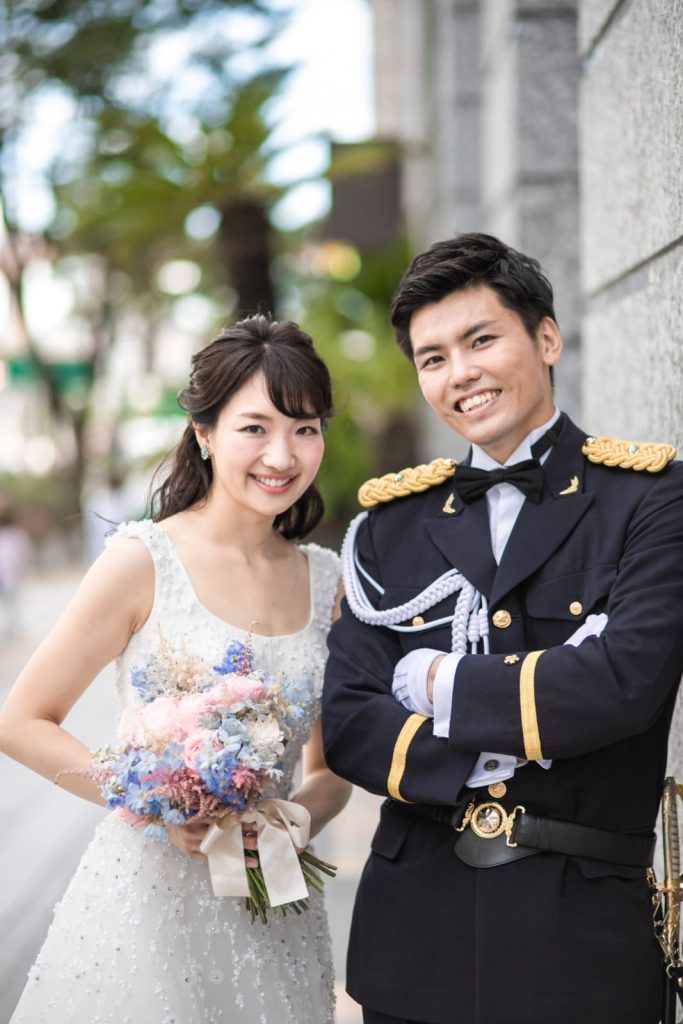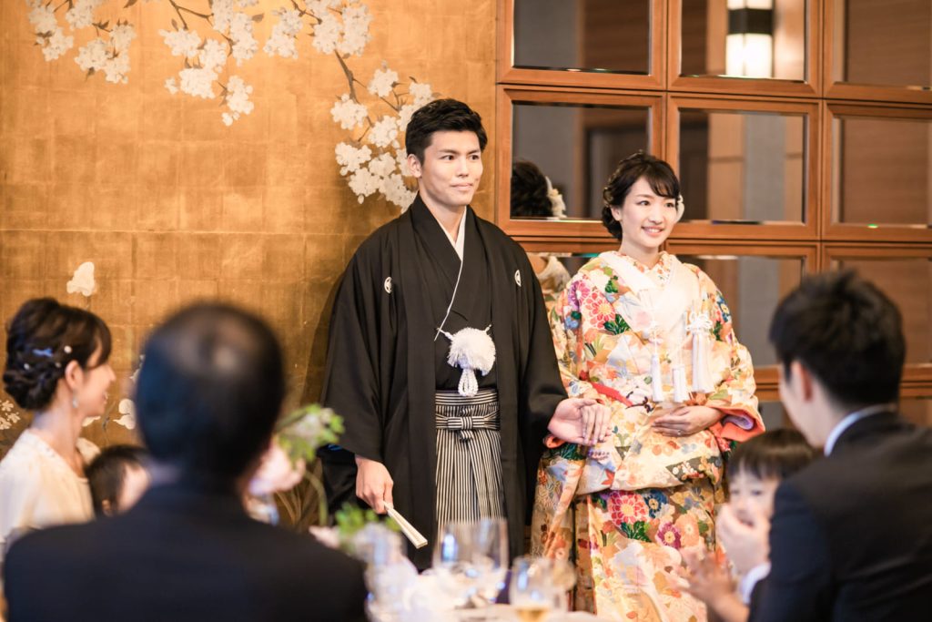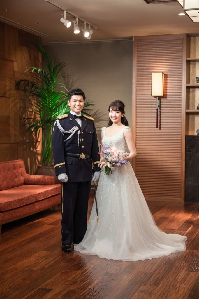 お色直しでは雰囲気を変えてご新郎さまのお仕事の正装と新婦さまはウェディングドレスを