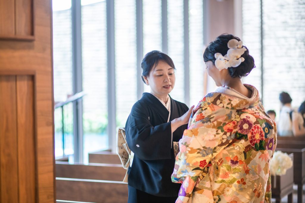 新婦さまご入場前にお母様から最後のお支度をお手伝いいただくセレモニーを