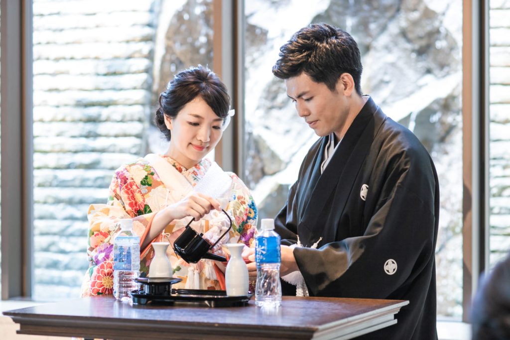 両家それぞれの土地の水をひとつの盃に注ぎ合わせて飲む日本古来からの儀式