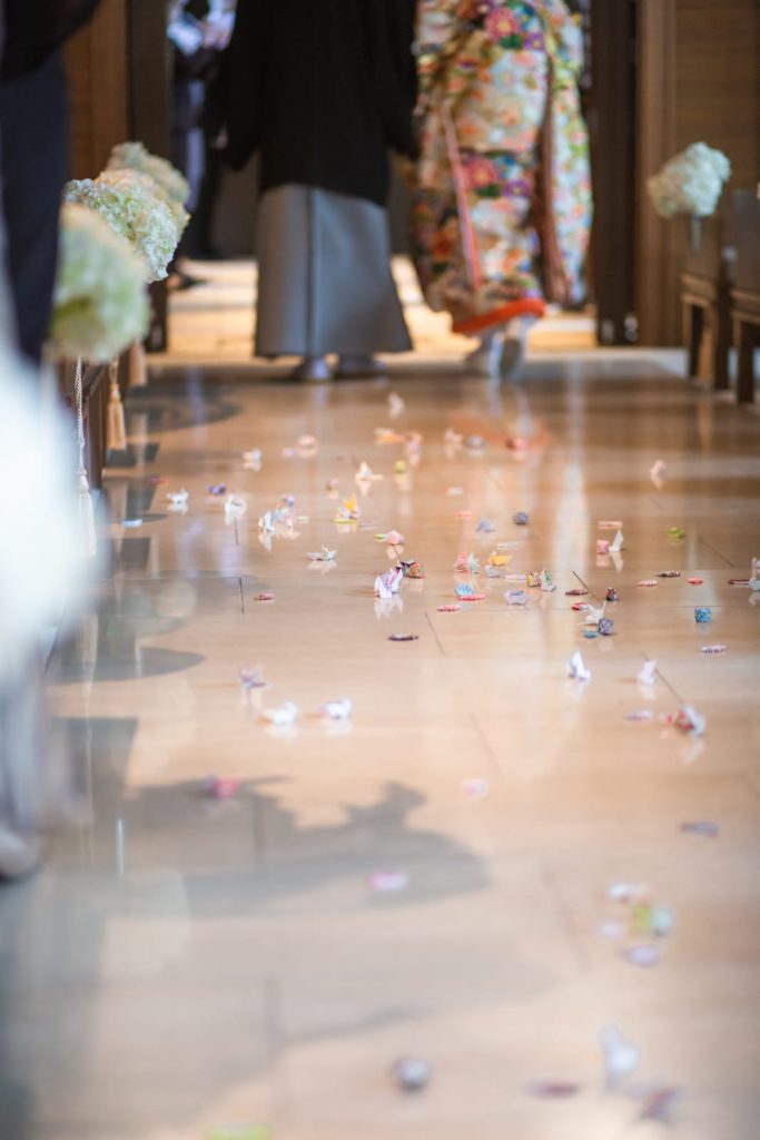 和装に合わせて折り鶴シャワーを