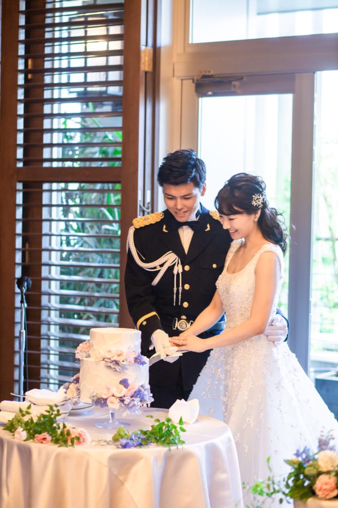 会場装花に合わせたフワラーケーキにケーキ入刀&ファーストバイト