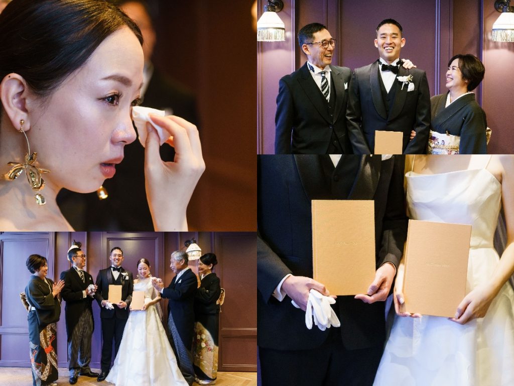 親御さまからおふたりの誕生から今日までの想いを綴った「Just for you」のBOOKを受け取るおふたり