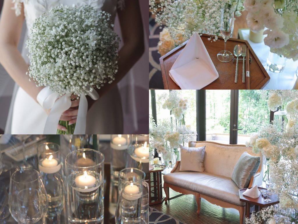 メインのソファ席周りを彩る真っ白なお花はかすみ草、トルコ桔梗、紫陽花