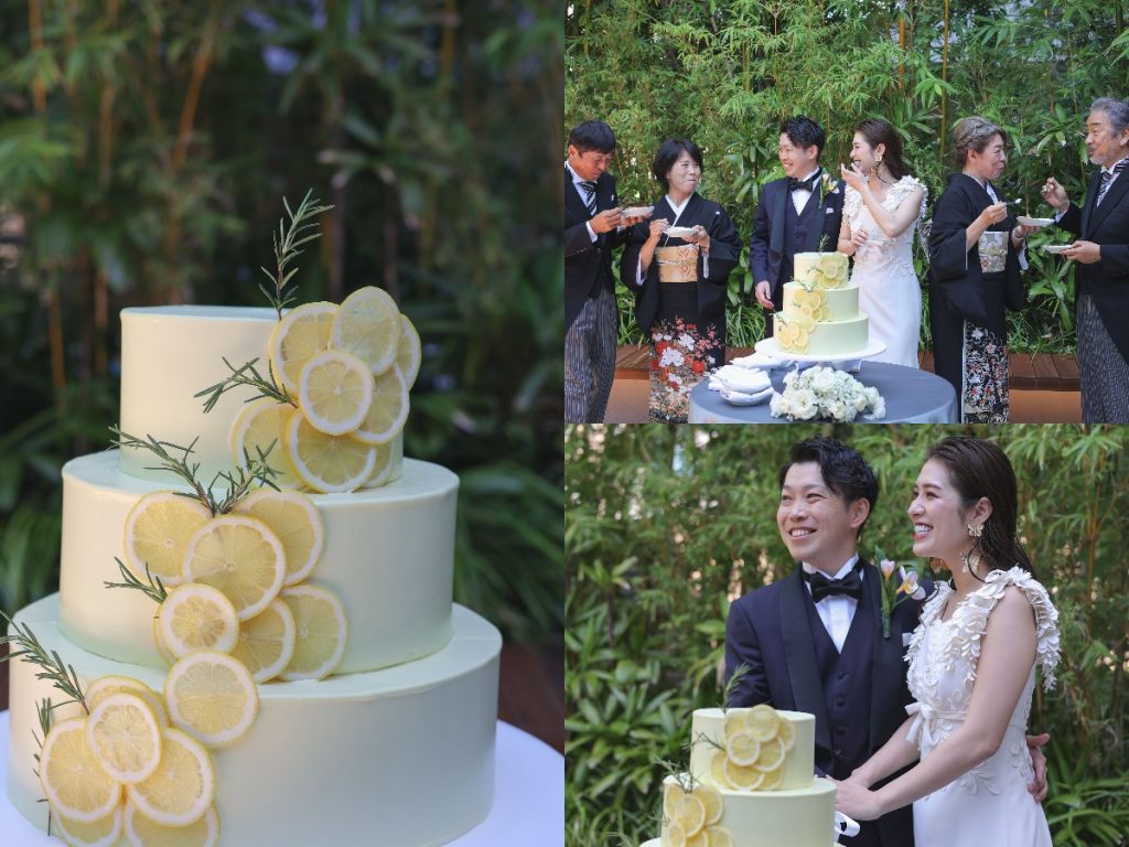 テラスの鮮やかなグリーンに映えるレモンを使ったオーダーメイドウェディングケーキ