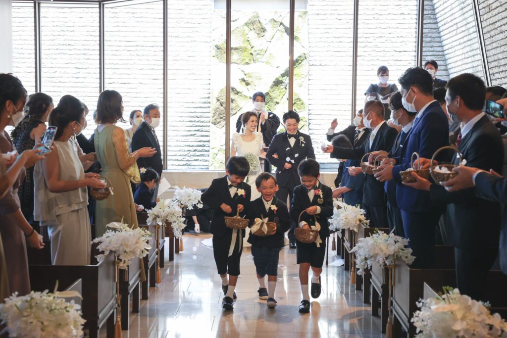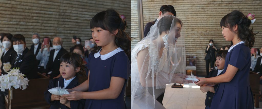 挙式では姪御さまがリングベアラー、甥御さまがブラワーボーイとして登場