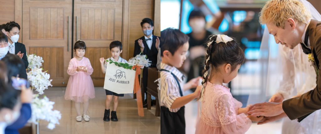 可愛らしいフラッグボーイ&リングガール 新郎さまが優しく指輪を受け取ります