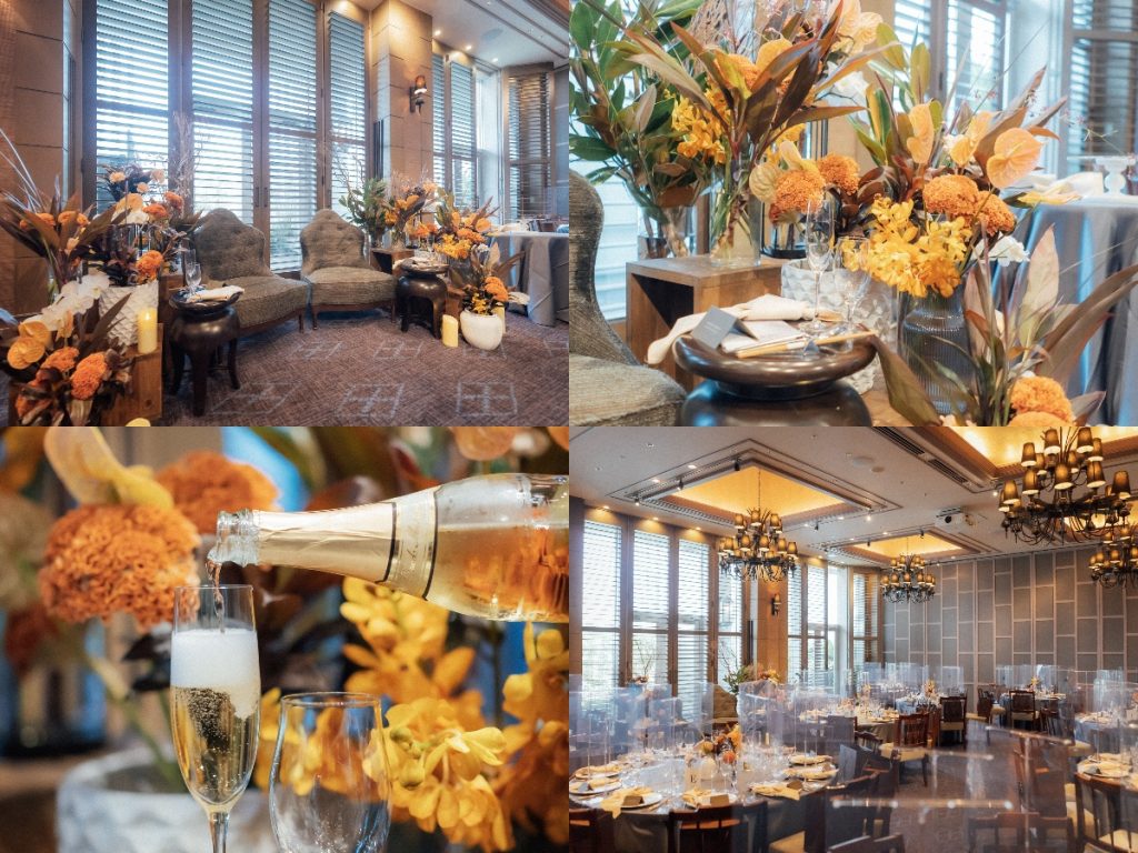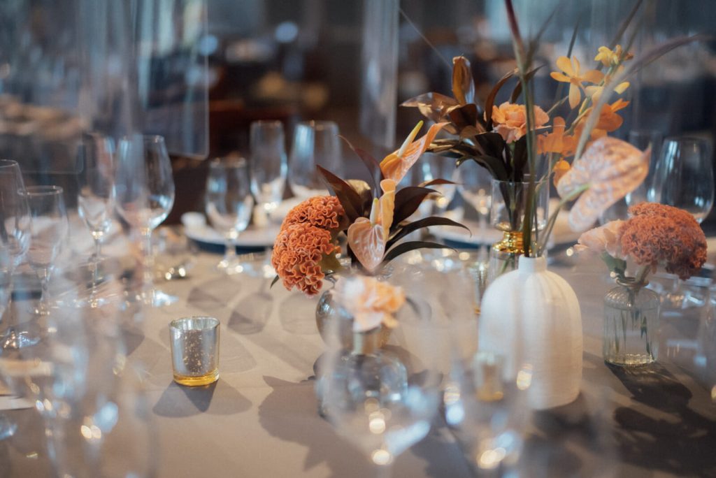 一足先にゲストに秋を感じてもらえるようなテラコッタとボルドーをテーマカラーに花材をセレクト