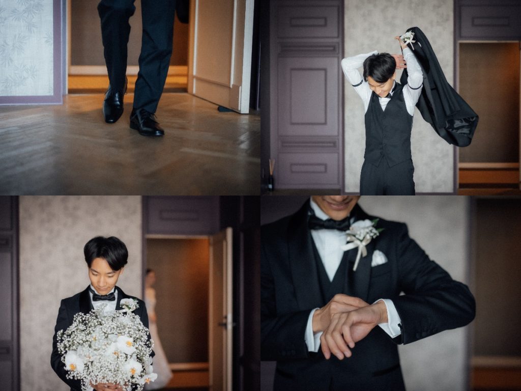 ブーケを手に新婦さまの到着を待つ新郎さま
