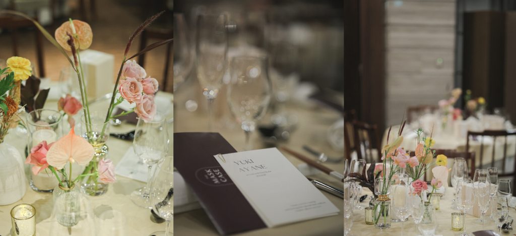 グラスと陶器の質感の異なる花器をミックスしたゲストテーブルに