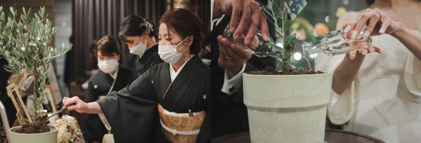 ゲストが土を入れてくださったオリーブの木にお二人を育んだ水を注ぎます