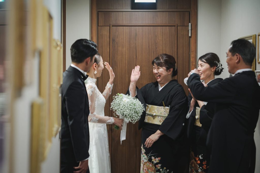 おふたりの晴れ姿に歓声があがったあとはハイタッチでリラックスした雰囲気に