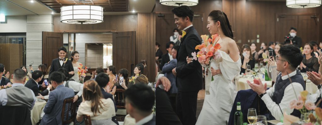 新婦さまは妹さまと、新郎さまは弟さまと、それぞれサプライズエスコートでお色直し退場へ
