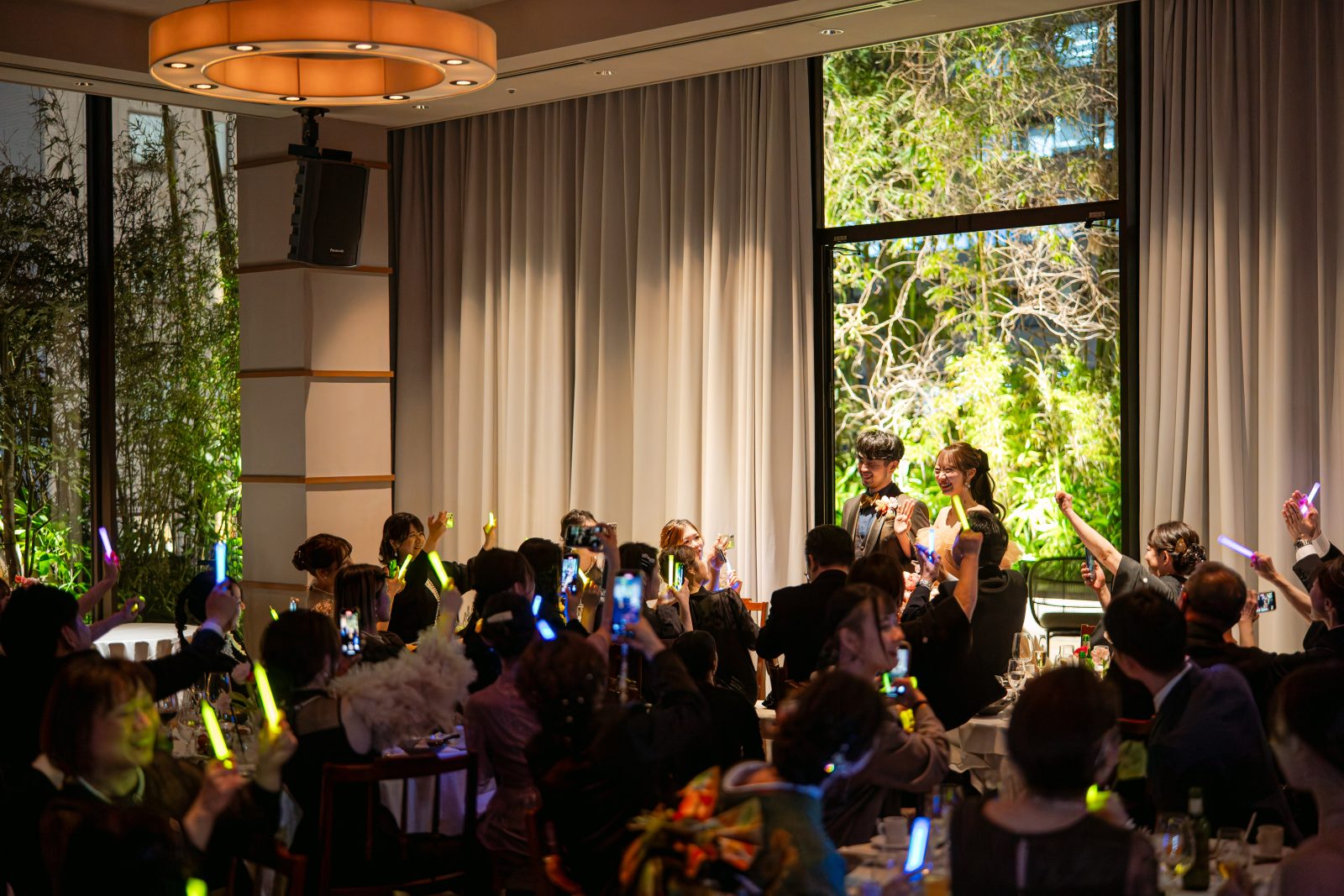 受付で選んでもらったペンライトでおふたりの入場を迎えるゲストの皆様