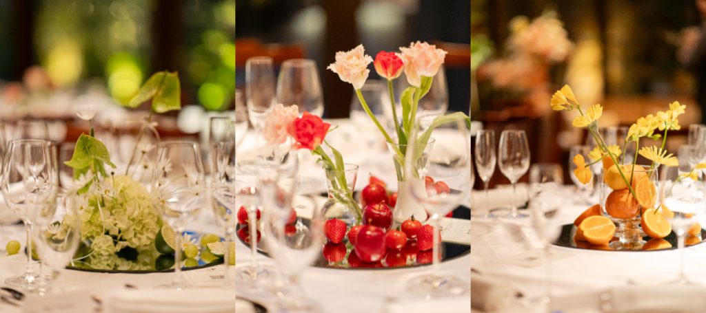 ゲストテーブルは3つのパターン用意し、フルーツも一緒にデコレーションした